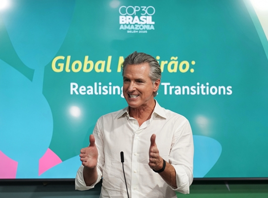 차기 미국 민주당 대권주자로 유력한 개빈 뉴섬 캘리포니아 주지사가 제30차 유엔기후변화협약 당사국총회(COP30)에서 도널드 트럼프 미국 대통령을 향