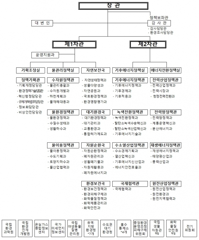 기후에너지환경부 1차관은 부처 운영과 물 정책, 기후를 제외한 환경 정책을 담당하고, 2차관은 기후와 에너지 정책을 맡는다. 2차관 아래에는 '기후에너지정책실'과 '에너지전환정책실'이 배치됐다. 기후에너지정책실에 기후에너지정책관·녹색전환정책관·수소열산업정책관·국제협력관, 에너지전환정책실에 전력산업정책관·전력망정책관·재생에너지정책관·원전산업정책관이 배치된다.