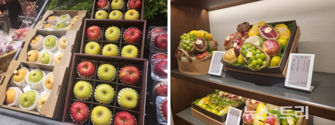 현대백화점 식품관 매장에서도 상자 형태의 과일 선물세트에 스티로폼 완충제를 사용하고 있었다. 바구니 형태의 선물세트에서도 망고 등 무른 재질의 과일에는 스티로폼 완충제가 빠지지 않았다.