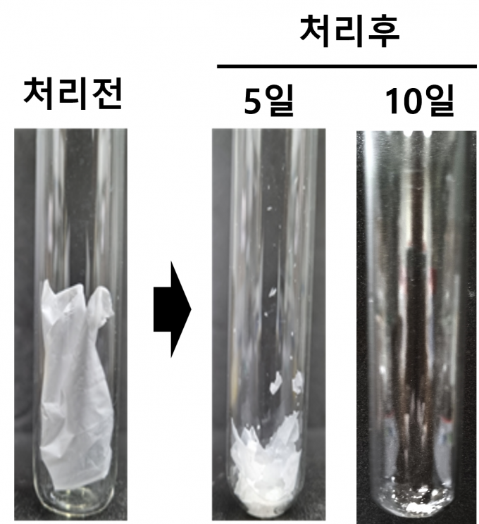 연구진이 이 균주를 폴리부틸렌숙신산염 필름에 처리해 10일간 관찰한 결과, 필름의 약 74%를 원료물질 상태로 분해해 자신의 성장에 이용하는 것으로 나타났다.