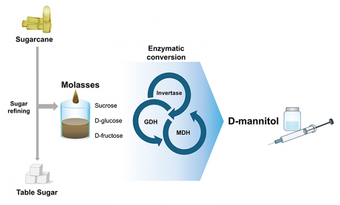 광주과학기술원(GIST) 신소재공학과 권인찬 교수 연구팀은 사탕수수 정제 과정에서 나오는 부산물 '당밀'을 효소 반응만으로 'D-만니톨(D-mannitol)'로 전환하는 친환경 기술을 개발했다고 22일 밝혔다.