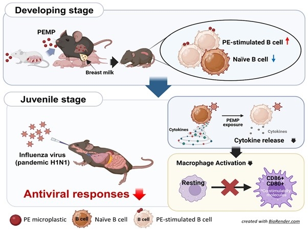 이와 함께 새끼 생쥐의 성장기 내내 항바이러스 면역물질인 인터페론과 염증성 사이토카인 분비가 저하됐다. 이는 면역 저하가 일시적인 반응이 아니라, 면역 발달 과정 전반을 교란해 바이러스에 대한 감염 저항성을 떨어뜨릴 수 있음을 보여준다고 연구팀은 설명했다.