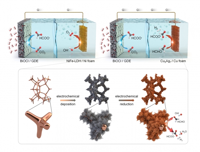 울산과학기술원(UNIST) 신소재공학과 조승호 교수와 에너지화학공학과 권영국·이재성 교수팀은 이산화탄소를 '포름산'으로 전환할 수 있는 초저전압 전기화학시스템을 개발했다고 12일 밝혔다. 이 시스템은 '포름산' 생산량을 3배 가까이 늘리는데 반해 전력소모를 종전보다 4분의 1로 절감할 수 있다.