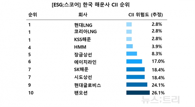 뉴스트리는 기후솔루션이 올시데이터(Allsea Data)의 CII 평가시스템을 활용해 산출한 선종별 CII 데이터를 기반으로, 국내 주요 해운사 10곳의 위험도를 추정해본 결과, 우리나라 해운사들은 선종 구성에 따라 CII 위험도가 크게 차이는 것으로 나타났다. CII는 기업 단위로 공개되지 않는 '기업 비공개' 데이터지만, 선대 구성만으로도 ESG 성적을 일정 부분 가늠할 수 있다.