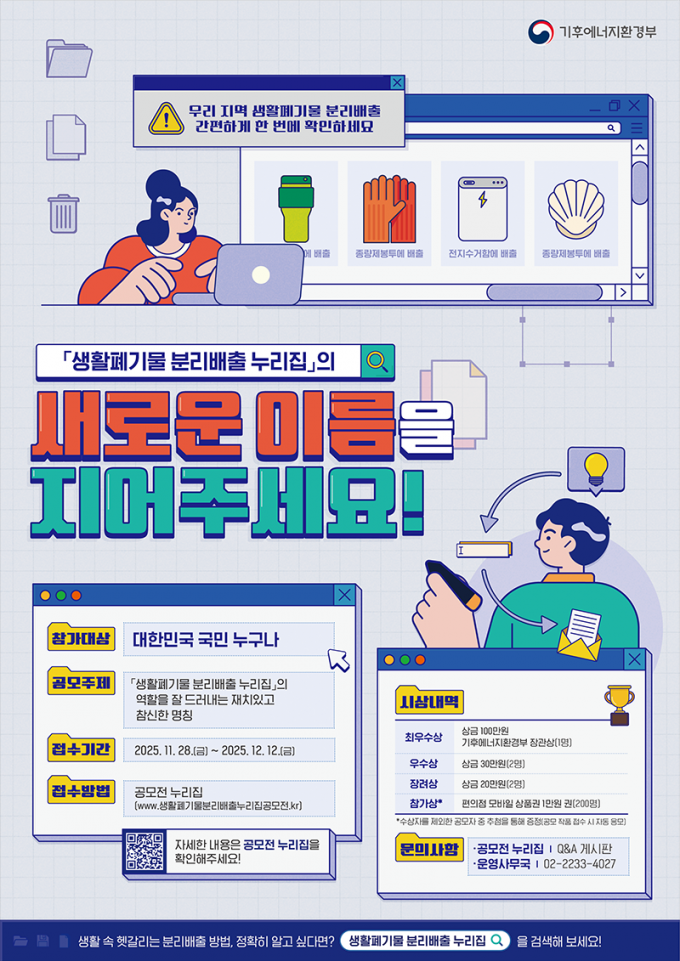 기후에너지환경부가 오는 28일부터 12월 12일까지 '생활폐기물 분리배출 누리집'의 새로운 이름을 공모한다고 27일 밝혔다.