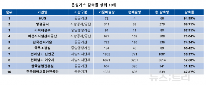 [ESG;스코어] 공공기관 온실가스 감축실적 1위는 'HUG'...꼴찌는 어디?