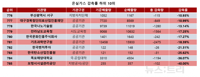 반면 감축률이 되레 마이너스를 기록한 기관들도 적지않았다. 배출량이 오히려 늘어난 곳은 보령시시설관리공단(-40%), 목포해양대학교(-36.07%), 한국탄소산업진흥원(-25.62%), 한국벤처투자(-21.31%), IBS(-18.39%), 전라남도교육청(-17.25%) 등이다. 기준배출량보다 순배출량이 더 높아진 '역(逆)감축기관'이다.