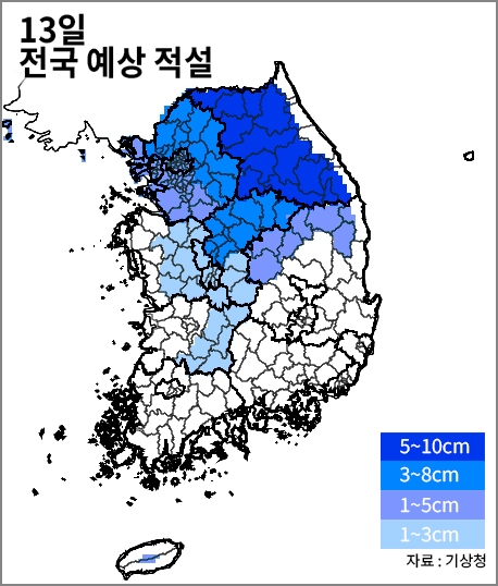 특히 13일 늦은 오후부터 경기 북부·남동부와 강원 내륙·산지, 충북 북부, 제주도 산지를 중심으로 시간당 1~3㎝의 강하고 무거운 '습설'이 내릴 것으로 예보됐다. 예상 적설량은 강원 내륙·산지 5~10㎝, 경기 북부·남동부, 충북 중·북부, 제주도 산지 3~8㎝, 서울·인천·경기 남서부, 서해5도, 충북 남부, 경북 북부 내륙·북동 산지 1~5㎝, 대전·세종·충남 내륙, 전북 동부 1~3㎝, 경남 서부 내륙 1㎝ 안팎이다.