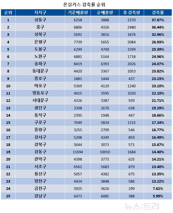 ▲서울시 자치구 온실가스 감축률 순위 ©newstree