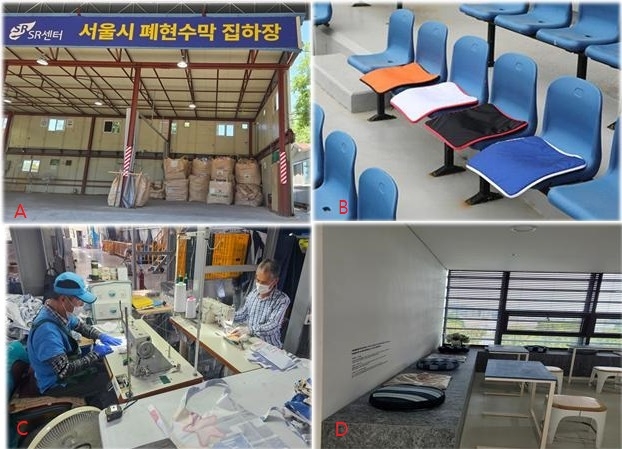 ▲폐현수막 공용집하장(A)을 운영하는 서울시는 공공부문 최우수, 현수막으로 방석을 제작한 건보공단과 현대아울렛(B)은 민관협업에서 '최우수'로 선정됐다. 폐현수막을 재활용하는 전문인력을 운영한 경북 예천군(C)과 폐현수막으로 가구를 만든 충북 청주시(D)는 우수상을 받았다. (사진=기후에너지환경부)