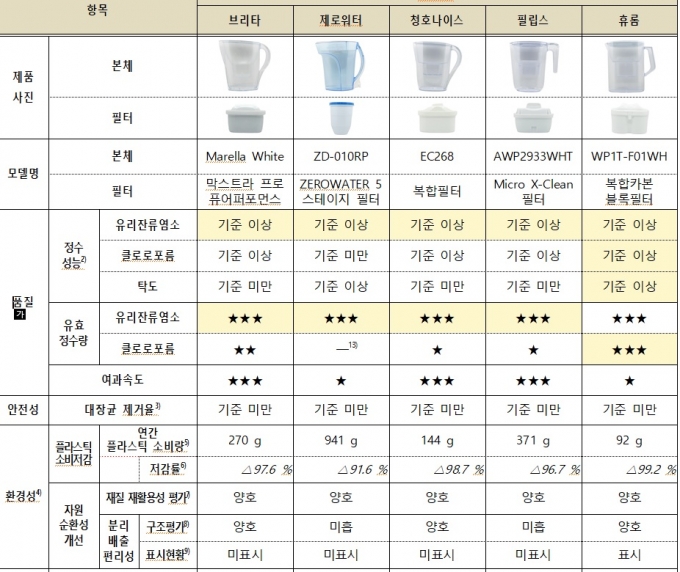 필터의 성능저하 없이 정수 가능한 물의 양인 유효정수량은 유리잔류염소의 경우 전 제품이 우수했다. 클로로포름은 휴롬(WP1T-F01WH)이 상대적으로 정수량이 많아 우수한 것으로 평가됐다. 물 여과속도는 브리타(Marella White), 청호나이스(EC268), 필립스 (AWP2933WHT)가 다른 제품에 비해 상대적으로 빨랐다.