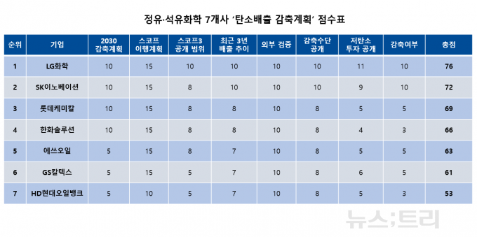 그 결과, LG화학은 100점 만점에 76점을 받아 1위를 차지했다. SK이노베이션이 72점으로 그 뒤를 바짝 쫒았고, 롯데케미칼(69점)과 한화솔루션(66점), 에쓰오일(63점), GS칼텍스(61점)가 그 뒤를 이었다. HD현대오일뱅크는 53점으로, 유일하게 50점대를 기록했다.
