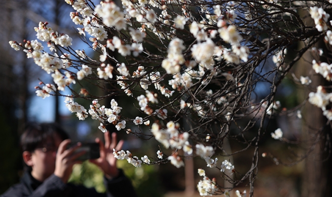 ▲25일 오후 경남 창원시 경남도청 앞에 핀 매화 (사진=연합뉴스)