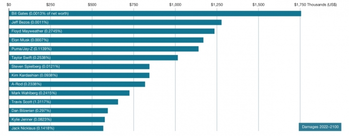 온실가스 배출에 따른 기후손실 및 피해액을 정량화한 이번 연구에서 빌 게이츠가 전용기 이용을 통해 약 175만달러(약 26억원)의 피해를 유발한 것으로 나타났다. 이는 개인단위 온실가스 피해액 가운데 가장 큰 규모다.