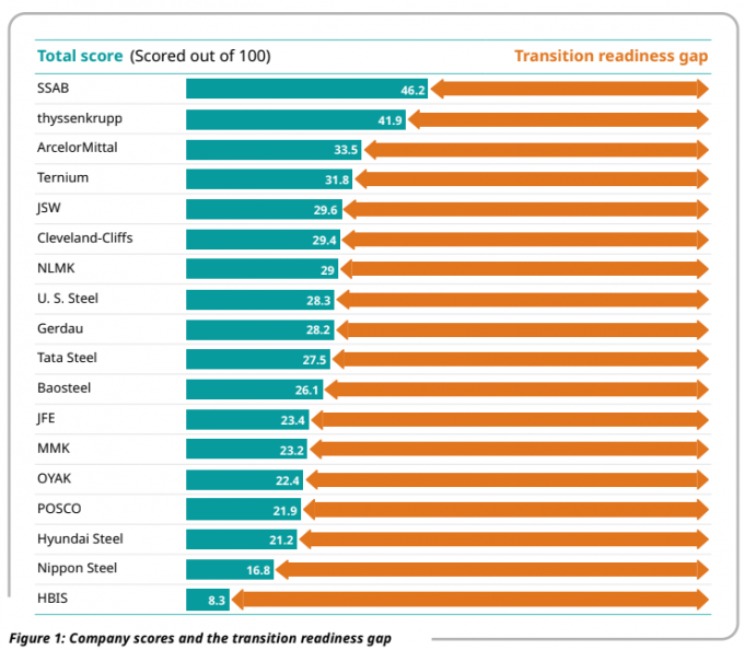 평가대상 철강기업 가운데 스웨덴의 SSAB가 46.2점으로 가장 높은 점수를 받았다. 독일의 티센크루프가 41.9점으로 그 뒤를 이었다. 이들은 석탄 설비 재투자나 고로 개수 없이 녹색철강 도입과 고로 폐쇄 계획을 마련하고 있다는 점에서 다른 기업들과 차별화됐다. 다만 두 기업 모두 아직 필요한 전환 수준에는 크게 못 미치고 있으며 녹색철강의 실제 확대 및 이행이 필요한 상황이라고 스틸워치는 설명했다.