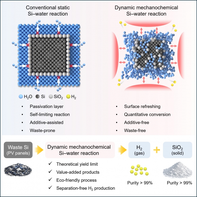 실리카막을 제거하는 원리는 실리콘과 물을 작은 구슬이 들어있는 용기에 넣고 굴리면서 구슬과 실리콘 입자를 서로 부딪히게 해 실리카 보호막을 벗겨내는 것이다. 이같은 원리를 적용해 실험한 결과, 상용 실리콘 1g당 약 1706mL의 수소가 생산됐다. 이는 이론적 최대 생산량(1713mL g⁻¹)의 99.6% 수준이다. 일반적인 열화학 방식이 이론 최대치의 약 18~28%에 머무는 것과 비교하면 최대 5배 높은 수소 생산 효율이다. 또 폐태양광 패널에서 직접 얻은 실리콘 가루를 이용한 실험에서도 이론적 최대치의 약 98% 수준에 이르는 수소 생산 성능을 기록했다.
