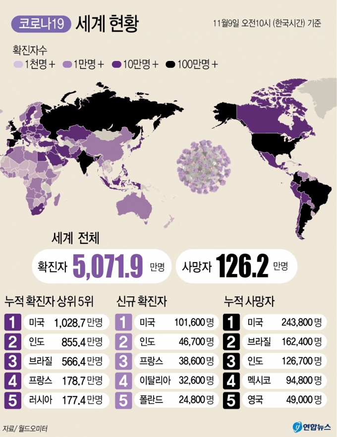 전세계 코로나19 확진자가 9일 기준으로 5000만명을 넘어섰다. 지난해 12월 중국 우한에서 신종 코로나 바이러스 감염사례가 처음 확인된지 11개월만이다. 사망자도 126만2457에 이른다. 우리나라도 이날 코로나19 확진자가 126명 추가되면서 누적 확진자수가 2만7553명으로 늘었고, 사망자도 480명을 기록하고 있다.