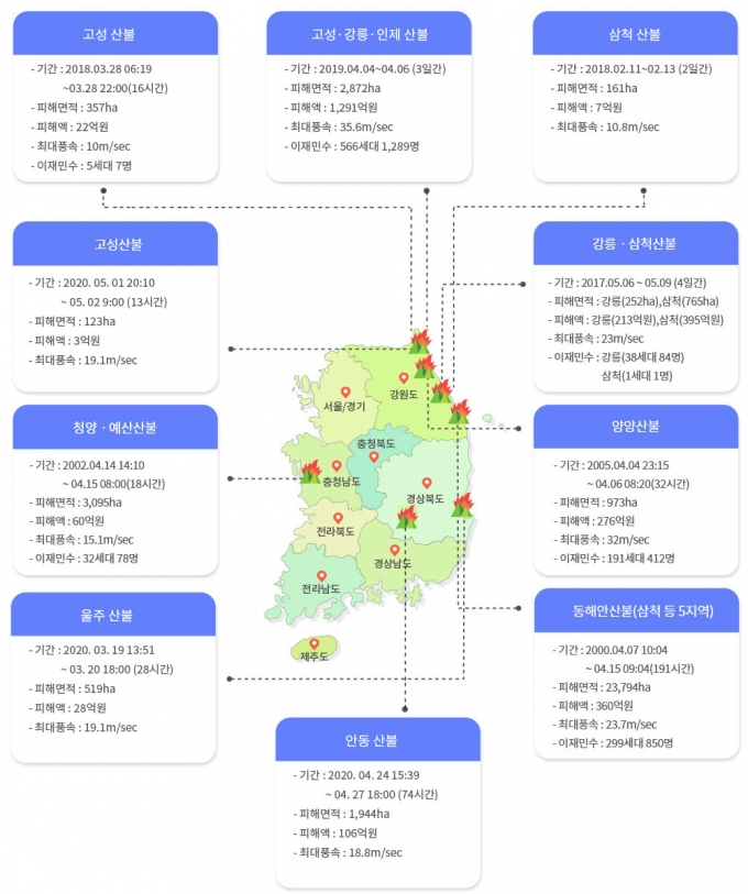 이번 산불은 현재까지 추정되는 피해규모로만 통계가 있는 1986년 이후 역대 두번째다. 역대 가장 피해가 컸던 산불은 2000년 동해안에서 발생한 산불로, 당시 강원도 삼척 등 5개 지역에 걸쳐 2만3794ha 면적을 태웠고 360억원의 재산상 피해를 입혔다.