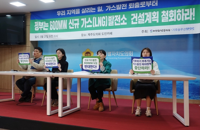 제주환경운동연합 등 제주도 내·외 시민사회단체 10곳은 27일 제주도의회 도민카페에서 가진 기자회견에서 "기후위기에 역행하는 가스발전을 더이상 확대하지 말고, 지역별 퇴출 계획을 조속히 마련해야 한다"고 촉구했다.