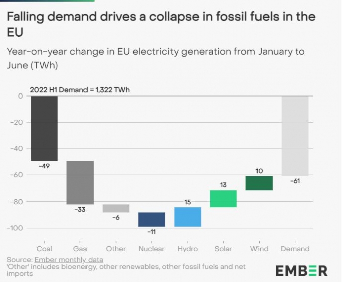 에너지 싱크탱크 엠버(Ember)가 30일(현지시간) 발표한 연구보고서에 따르면, 유럽연합(EU) 27개국은 올 1월~6월까지 전년 동기간에 비해 화석연료 발전량이 17% 줄었다. 이 기간동안 유럽연합이 화석연료로 생산한 전기는 410테라와트시(TWh)였다. 보고서는 "이는 월별 전력 생산량을 집계한 2015년 이후 가장 낮은 수준"이라며 "2000년 이후 가장 적은 양일 가능성도 매우 크다"고 설명했다.