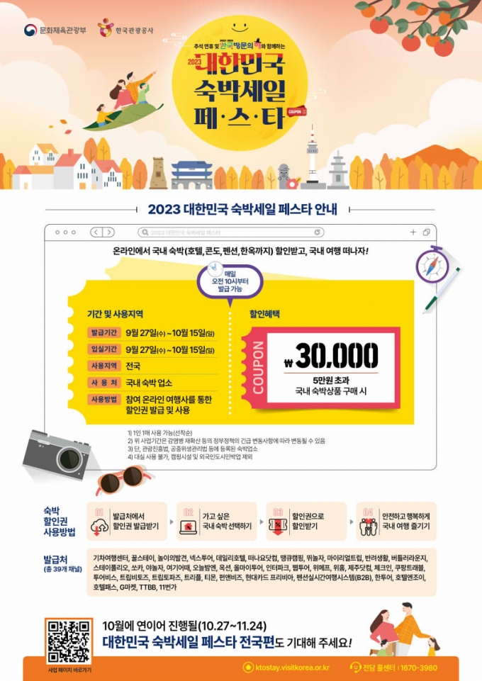 문화체육관광부와 한국관광공사는 국내 소비 진작과 지역관광 활성화 차원에서 9월 27일부터 10월 5일까지 '2023 대한민국 숙박세일 페스타'를 진행한다고 19일 밝혔다. 이번 페스타에는 총 44개 온라인 여행사와 3만여개 숙박시설이 참여하고 있다.