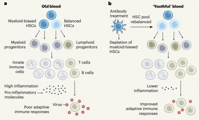 노화는 모든 유형의 혈액 세포에서 나타나는 현상인 HSC 변화와 관련이 있다. 젊을 때는 림프계와 골수계 세포 생산량이 균형을 이루는 HSC(bal-HSC)가 골수계 세포를 과도하게 생성하는 HSC(my-HSC)보다 우세하다.