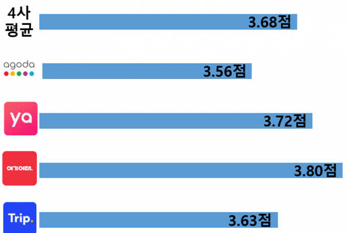 한국소비자원이 국내 상위 4개 여행플랫폼을 최근 2년 이내에 이용한 경험이 있는 20~50대 소비자 1600명을 대상으로 온라인 설문을 실시한 결과, 이들 4사에 대한 종합만족도는 3.68점으로 나타났다. '여기어때'가 3.80점으로 가장 높았고, 다음으로 야놀자(3.72점), 트립닷컴(3.63점), 아고다(3.56점) 순이었다.