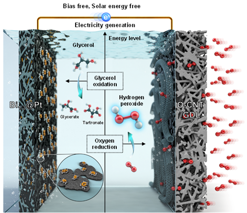 연구진은 시스템 양극에 비스무트가 코팅된 백금 촉매를, 음극에는 탄소나노튜브를 적용해, 글리세롤 산화와 산소 환원 반응이 이론적으로 가능한 최대 전위차에서 일어나도록 설계했다. 전위차가 클수록 전자가 흐를 수 있는 '에너지 낙차'가 커져, 두 반응이 쉽게 일어난다.