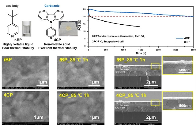 연구진이 개발한 4CP(4-(N-carbazolyl)pyridine)는 고체 형태로, 액체 첨가제와 달리 휘발성이 없어 이러한 문제를 근본적으로 막을 수 있다. 고온에서 안정성이 뛰어날 뿐만 아니라 구성층 간 계면을 균질하게 만들어 전하가 잘 이동하도록 돕는다. 전하 이동이 원활해지면서 광전변환효율도 함께 높아진다.
