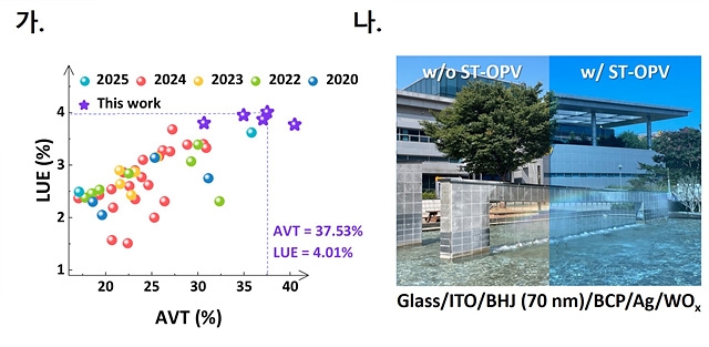 이러한 메커니즘 덕분에 전류 손실이 줄고 소자의 수명도 늘어나, 반투명 유기태양전지의 실용화 가능성을 크게 높인 것으로 평가된다. 실제 성능에서도 의미 있는 성과를 거뒀다. 연구팀은 평균 가시광선 투과율(AVT) 37.53%, 전력변환 효율(PCE) 10.7%를 달성했다. 또한 두 지표를 종합 평가하는 광 이용 효율(LUE, Light Utilization Efficiency)에서도 최고 수준인 4.01%를 기록하며, 동일 조건 내 반투명 유기태양전지 중 최상의 성능을 구현했음을 입증했다.