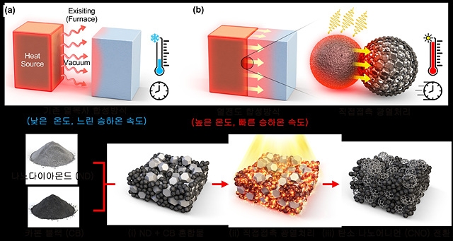 연구팀은 빛을 0.02초만 비춰도 순간적으로 3000℃의 초고온을 만들어내는 촉매 합성기술을 개발했다. 이 열을 단단하고 잘 반응하지 않는 '나노다이아몬드'(nanodiamond)에 쪼이면 전기가 잘 통하고 촉매로 사용하기 좋은 고성능 탄소 소재인 '탄소 나노어니언'(Carbon Nanoonion)이라는 새로운 소재로 바꿔준다. 이는 기존 열선 가열 기반의 열처리 공정보다 에너지 소비를 1000분의 1로 줄이는 동시에 공정 속도는 수백배 이상 줄여준다.