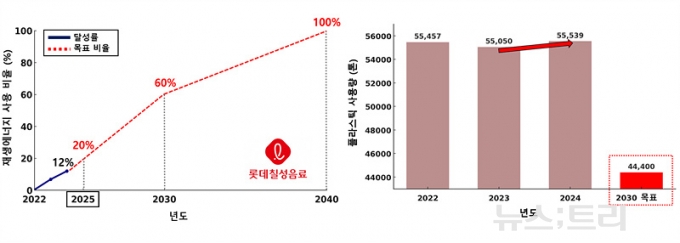 롯데칠성이 목표대로 2030년까지 재생에너지 60%를 달성하려면 2024년부터 매년 약 8%포인트(p)씩 재생에너지를 늘려야 한다. '2024년 지속가능성보고서'에서 밝힌 지난해 재생에너지 사용비율은 12%였으므로, 단순 선형 추세로 계산하면 올해 도달률은 최소 20% 수준에 이르러야 한다는 계산이 나온다. 하지만 올해 재생에너지 사용비율을 얼마나 늘렸는지 아직 공개되지 않고 있다.