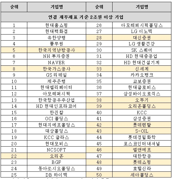 자산 2조원 이상의 대기업 가운데 현대홈쇼핑과 현대백화점, 유한양행, 풀무원, 한국지역난방공사가 올 하반기 서스틴베스트 ESG 평가에서 상위에 랭크됐다. 지난해 2위를 했던 KT는 하반기 발생한 사이버해킹 사건으로 50위 순위권 밖으로 밀려났고, 네이버는 7위로 밀렸다. 이 영향 탓인지 지난해 3위였던 현대홈쇼핑이 1위를 꿰찼다.
