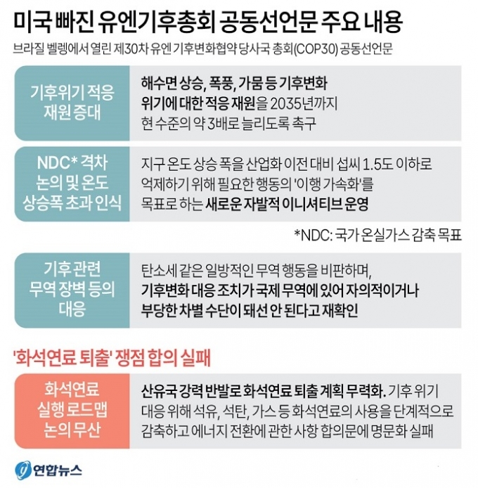 제30차 유엔기후변화협약 당사국총회(COP30) 최종 합의문에서 화석연료에 대한 언급이 빠져 '반쪽짜리'라는 지적을 받고있다.