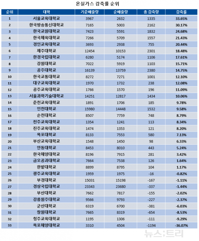 반면 감축률 하위 10개 대학은 목포해양대학교(-36.07%), 청주교육대학교(-9.29%), 창원대학교(-8.53%), 군산대학교(-6.03%), 강릉원주대학교(-2.37%), 부산대학교(-2.02%), 경상국립대학교(-1.44%), 부경대학교(-1.11%), 광주교육대학교(-0.82%), 한밭대학교(1.17%)로 나타났다. 특히 목포해양대·창원대·군산대은 기준배출량 대비 순배출량이 오히려 증가해 '역(逆)감축'을 보였다.