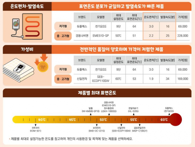 최대 설정온도 조건에서 제품 표면 온도를 20℃에서 35℃까지 상승시키는데 소요되는 시간(발열속도)은 최소 12분에서 최대 49분으로 제품 간에 차이가 있었다. 중·고가형 제품(6개 평균)이 34분인 반면 저가 제품(4개 평균)은 19분으로 1.8배 빨랐다.