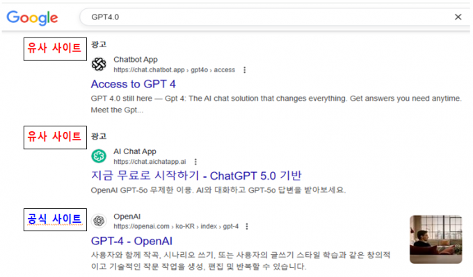 접속경로가 확인된 23건 가운데 91%(21건)는 구글 등 포털사이트에서 생성형 AI 서비스명을 검색한 뒤, 검색결과 상단에 노출된 광고 링크를 클릭해 접속한 것으로 확인됐다.