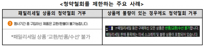 조사한 패밀리세일 사이트의 82.6%(19개)는 패밀리세일에서 구매한 상품의 청약철회가 불가능했다. 특히 13%(3개) 사업자는 구매한 상품에 하자가 있는 경우에도 청약철회를 제한하거나 교환만 가능하다고 안내했다.