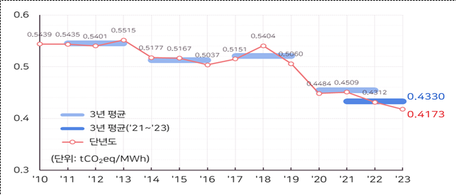2023년 전력배출계수는 1메가와트시(MWh)당 0.4173톤(tCO2eq)으로 공표됐다.