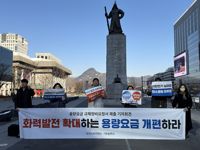 기후솔루션과 녹색소비자연대전국협의회는 6일 서울 광화문광장 이순신동상 앞에서 가진 기자회견에서 화석연료 발전을 보조하는 용량요금 지급구조에 대한 개편을 요구했다. 시민단체들은 이같은 내용을 담은 '규제정비요청서'를 규제개혁위원회에 제출했다고 밝혔다. 규제정비요청은 현실과 맞지 않거나 국민에게 불편을 주는 법령·제도를 고쳐달라고 정부에 공식 제안하는 제도다.