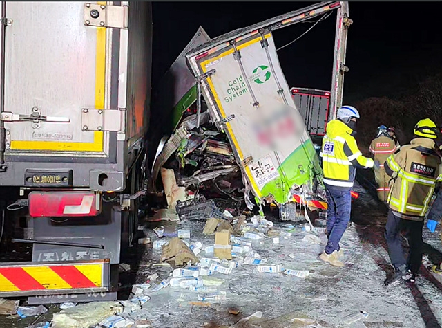 12일 연합뉴스에 따르면 이날 새벽 2시 46분쯤 청주시 상당구 문의면 서산영덕고속도로 청주 방향 문의청남대휴게소 인근에서 2톤 화물차가 앞서가던 14톤 화물차를 들이받는 사고가 발생했다. 이어 약 5분 뒤 9톤 화물차와 8.5톤 화물차가 잇따라 추돌했다.