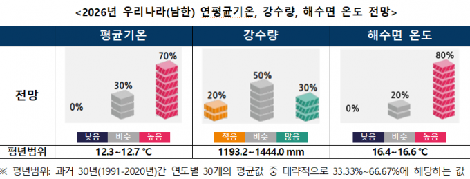 기상청 전망에 따르면 2026년 남한 평균기온은 평년(12.3~12.7℃)보다 높겠다. 대기 상층(약 5.5km)에 발달한 고기압성 순환의 영향으로 우리나라를 포함한 동아시아 기온은 평년보다 높을 가능성이 크다.