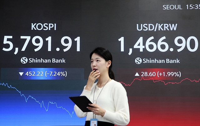 3일 코스피는 전거래일 대비 7.24% 내리며 5791.91로 장을 마감했다. 이날 단 하루에 452.22포인트 급락하면서 역대 최대치 낙폭을 기록했다. 6000선을 뚫은지 3거래일만에 6000선 아래로 밀려났다. 코스피200선물지수가 이날 정오께 5% 넘게 급락하면서 프로그램매도호가 일시효력정지(사이드카)가 한 달 만에 다시 발동되기도 했다.