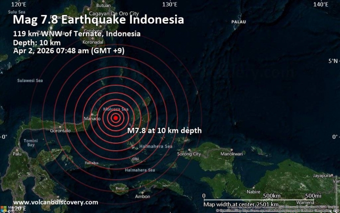 2일 오전 6시 48분(현지시간) 인도네시아 북몰루카 해역에서 발생한 이번 지진은 미국 지질조사국(USGS) 기준 규모 7.4로 집계됐다. 당초 7.8로 발표됐으나 이후 하향 조정됐다. 진원의 깊이는 약 10~35㎞ 수준으로 비교적 얕다. 진앙은 북몰루카주 테르나테에서 서북서 방향 약 127㎞ 해상으로 분석됐다.