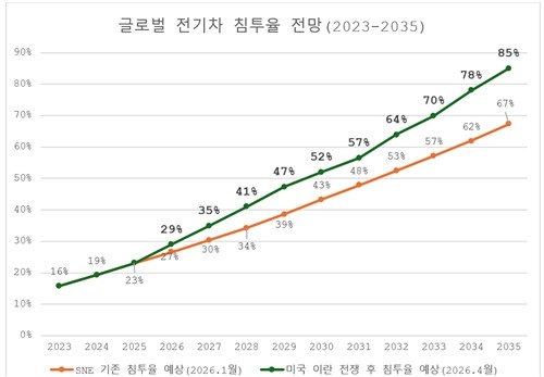 에너지분야 시장조사업체 SNE리서치는 올해 전세계 자동차 시장에서 전기차 등록대수 예상치를 27%에서 29%로 상향 조정했다고 7일 밝혔다. 중동 전쟁으로 기름값이 오르자, 이 부담을 줄이기 위해 전기차 구매가 늘어날 것으로 내다봤다. 실제로 올 3월 미국의 전기차 판매량은 2월에 비해 20% 증가했고, 국내 현대자동차도 내연기관 판매는 줄고 전기차 판매가 38% 증가했다. 기아 전기차 판매량은 무려 148.6% 증가했다.