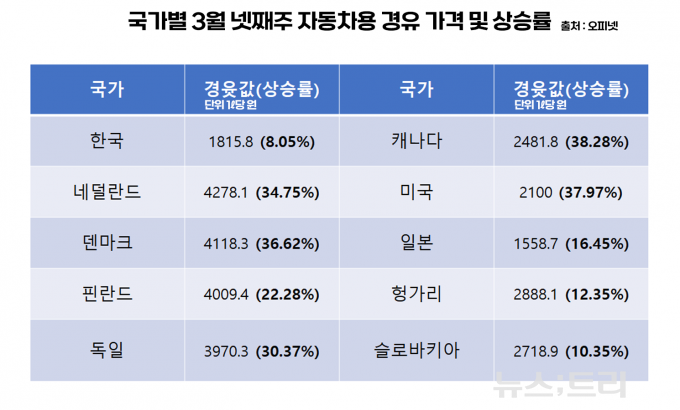 반면 같은 기간 한국의 평균 경윳값은 1ℓ 당 1680.4원에서 8.05% 상승한 1815.8원에 그쳤다.